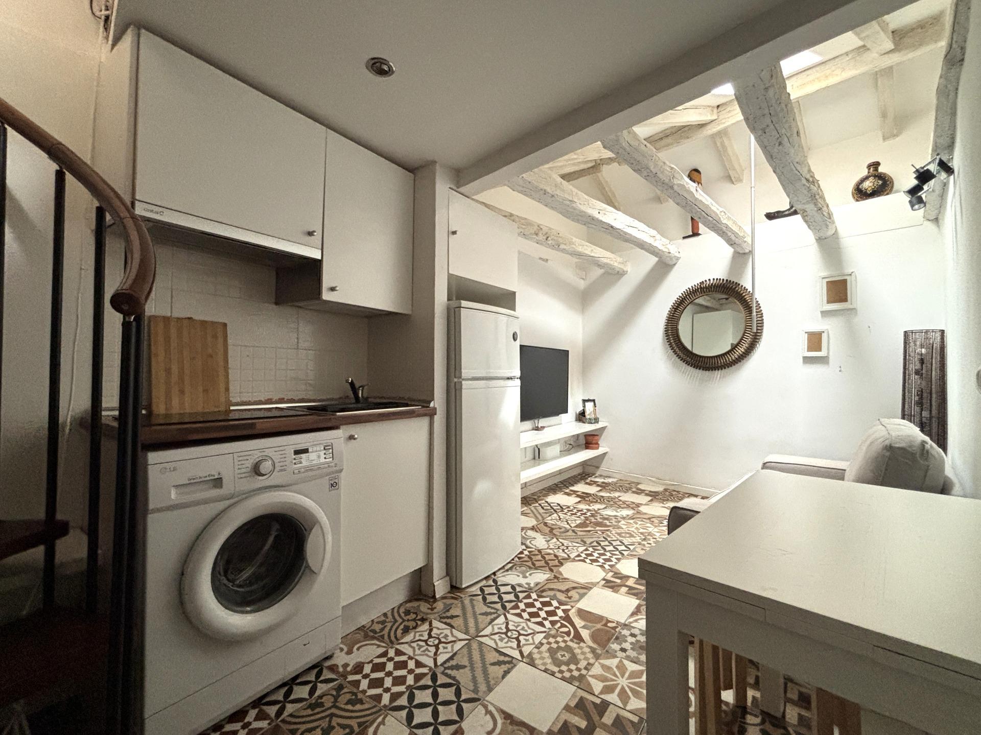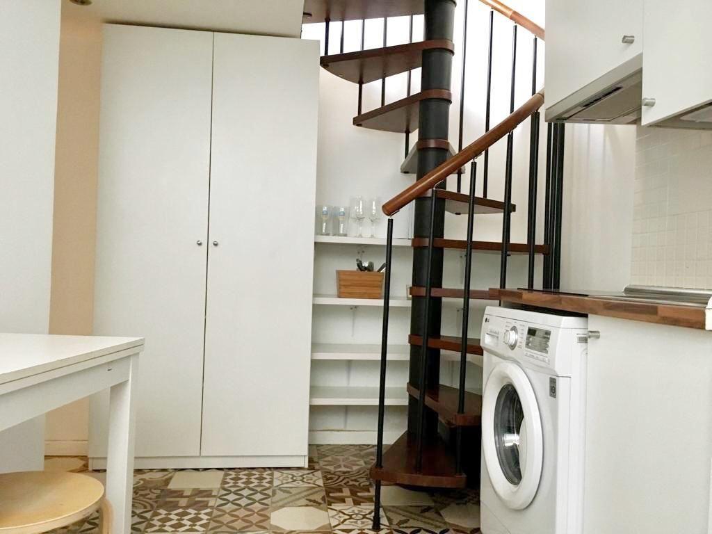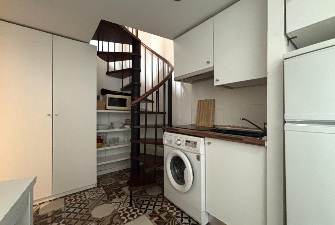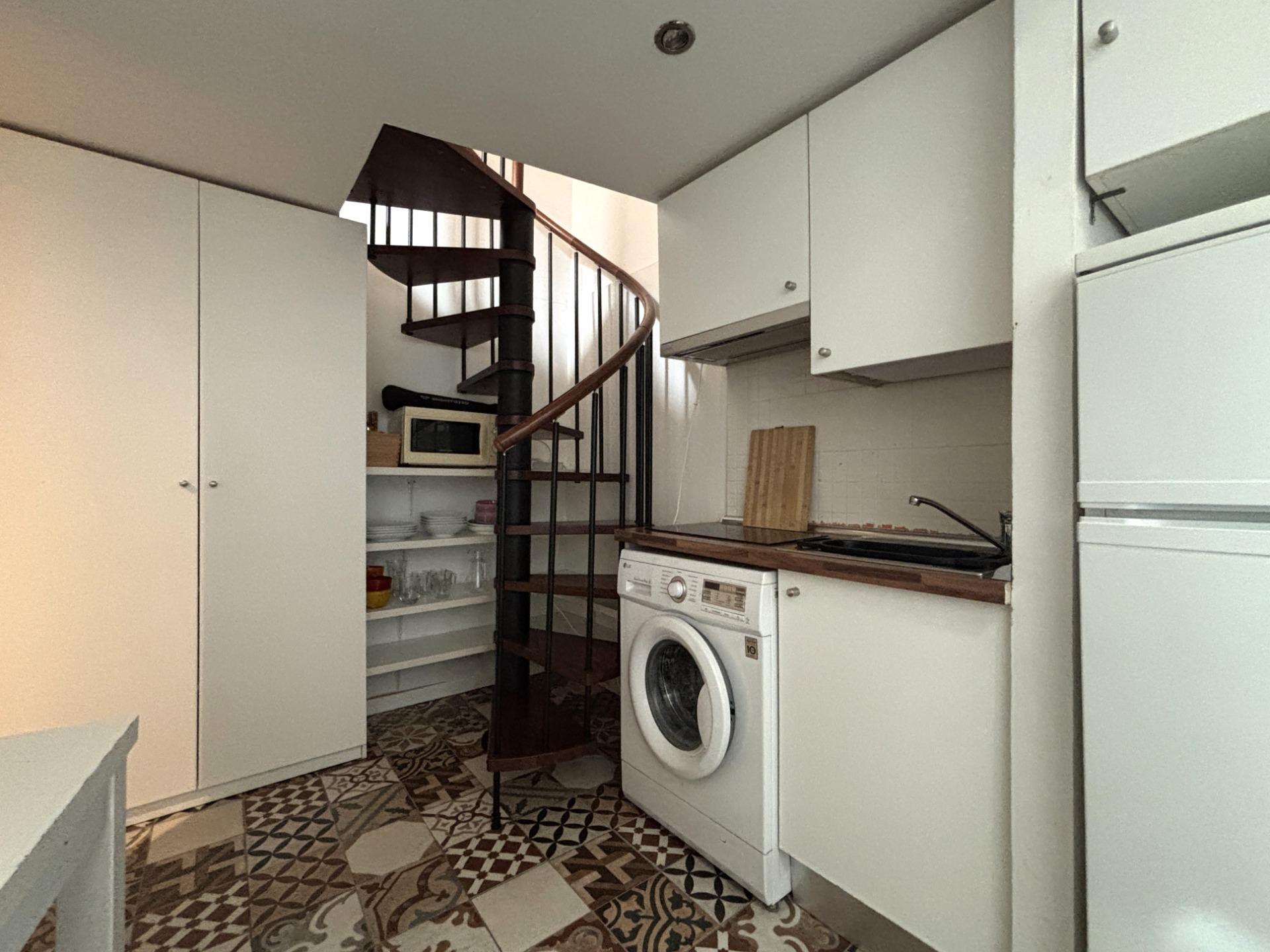 La cocina está integrada, equipada con electrodomésticos (lavadora integrada, frigorífico) y almacenamiento optimizado.