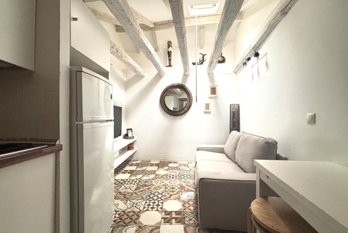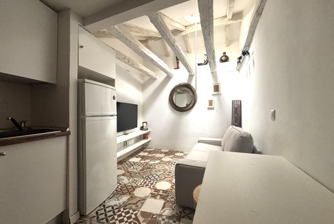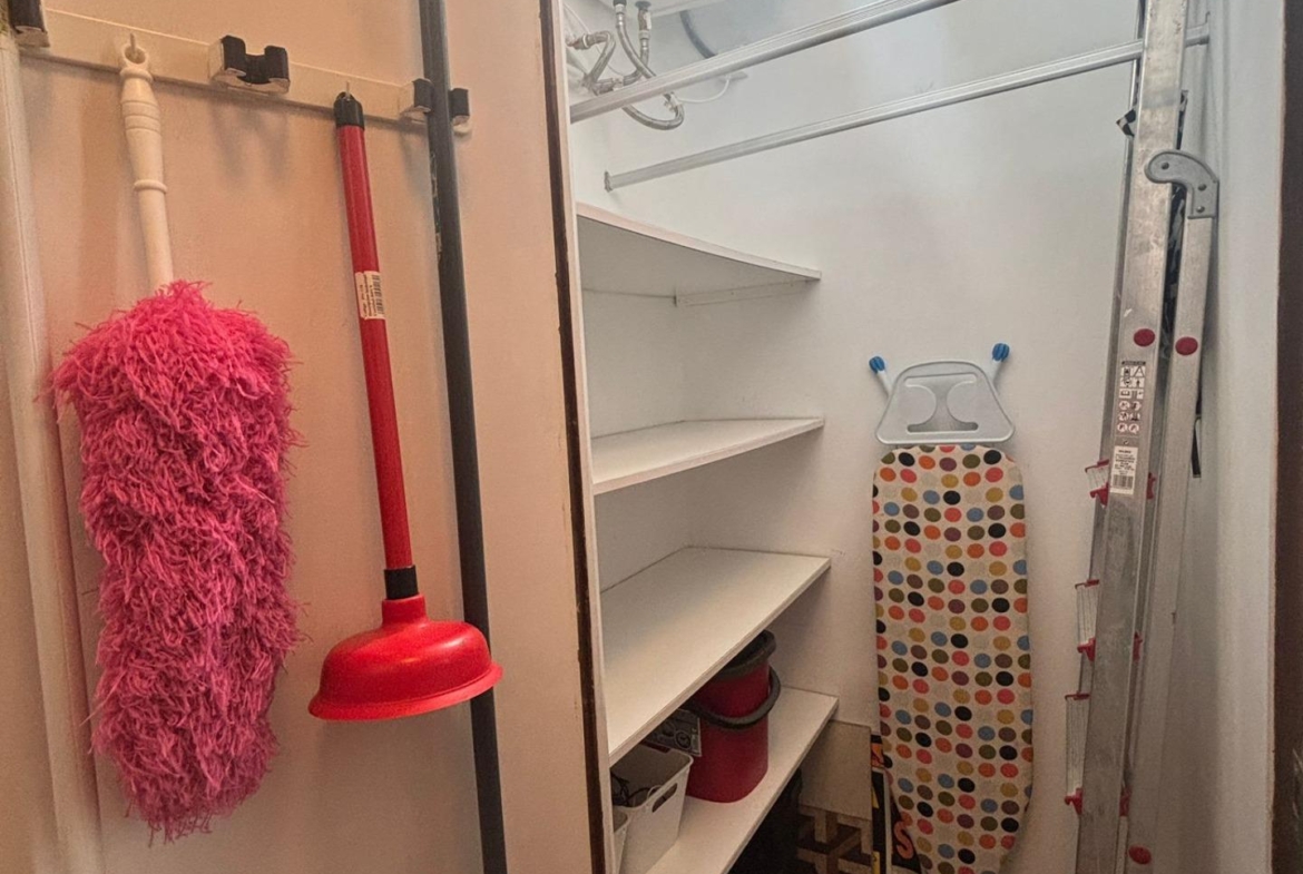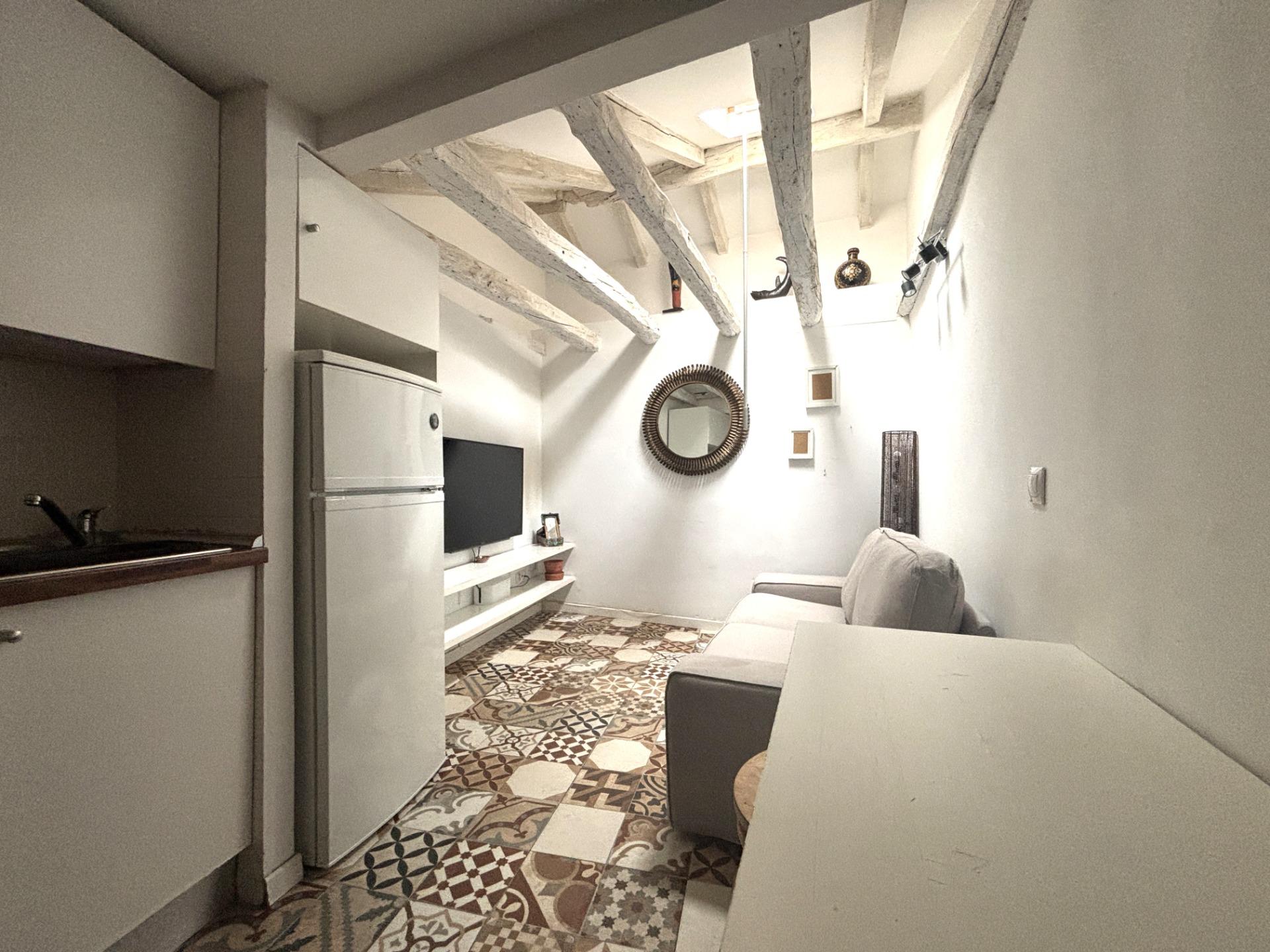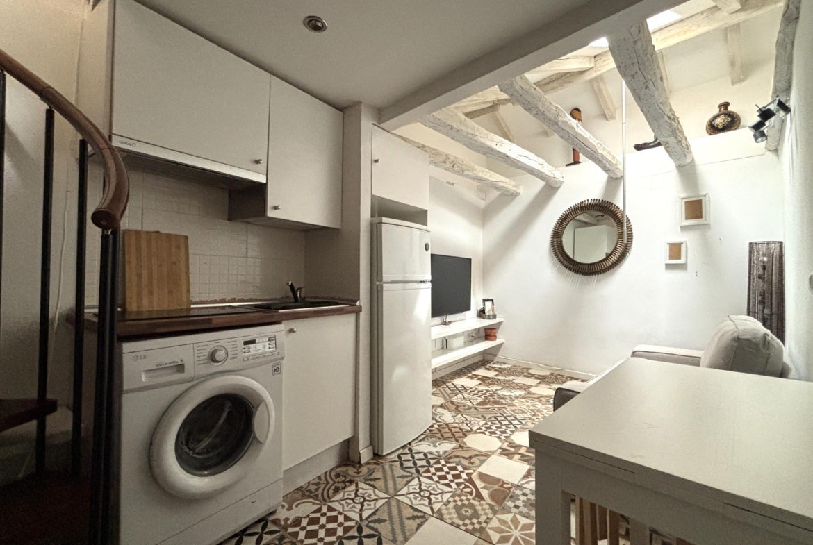 La cocina está integrada, equipada con electrodomésticos (lavadora integrada, frigorífico) y almacenamiento optimizado.