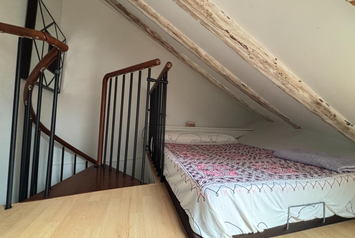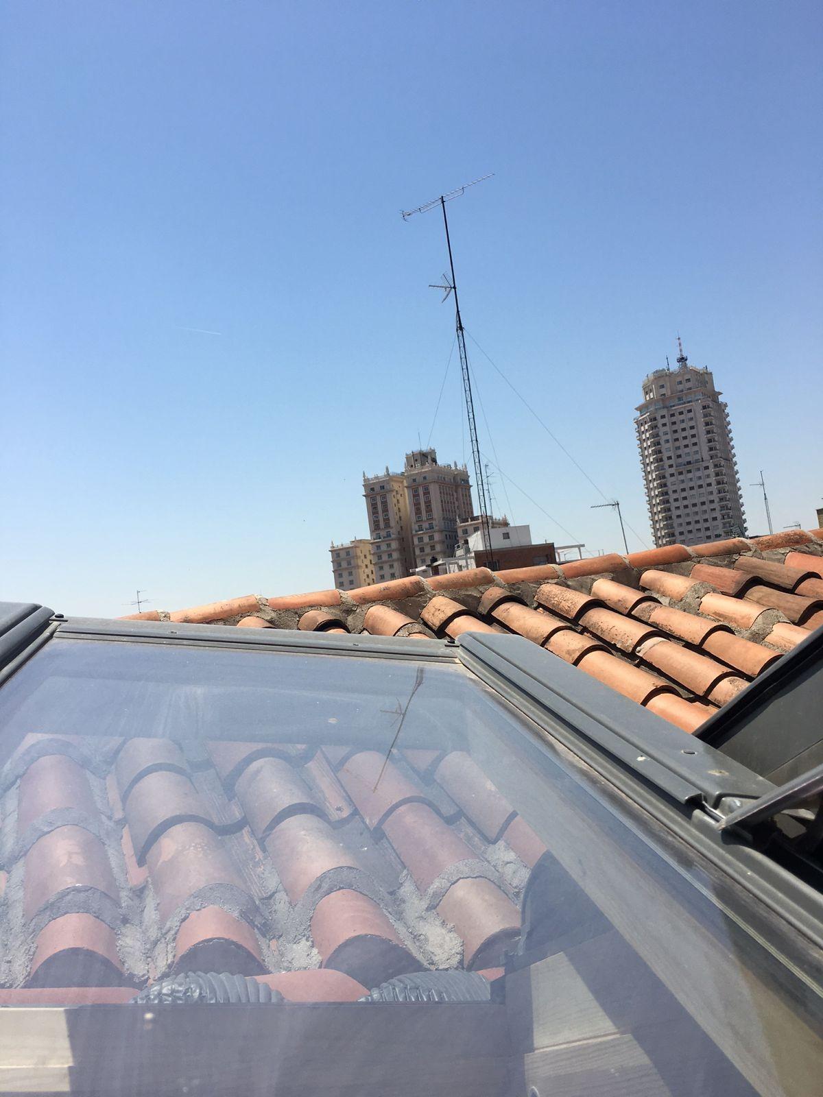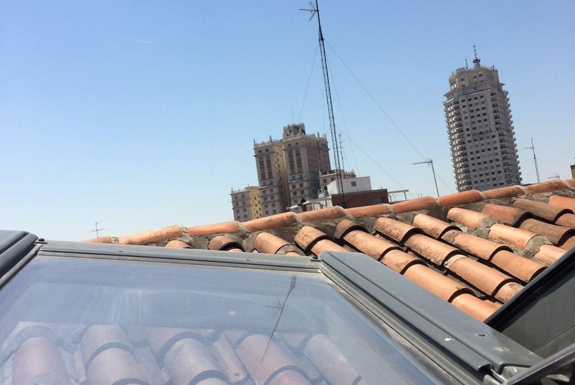 Subiendo por una escalera de caracol, se accede a la zona de descanso abuhardillada, sin mucha altura. Dispone de futón doble y armario empotrado a medida que aprovechan la caída del techo. Una ventana tipo Velux permite dormir viendo el cielo de Madrid y disfrutar de vistas a los icónicos rascacielos de Plaza de España.