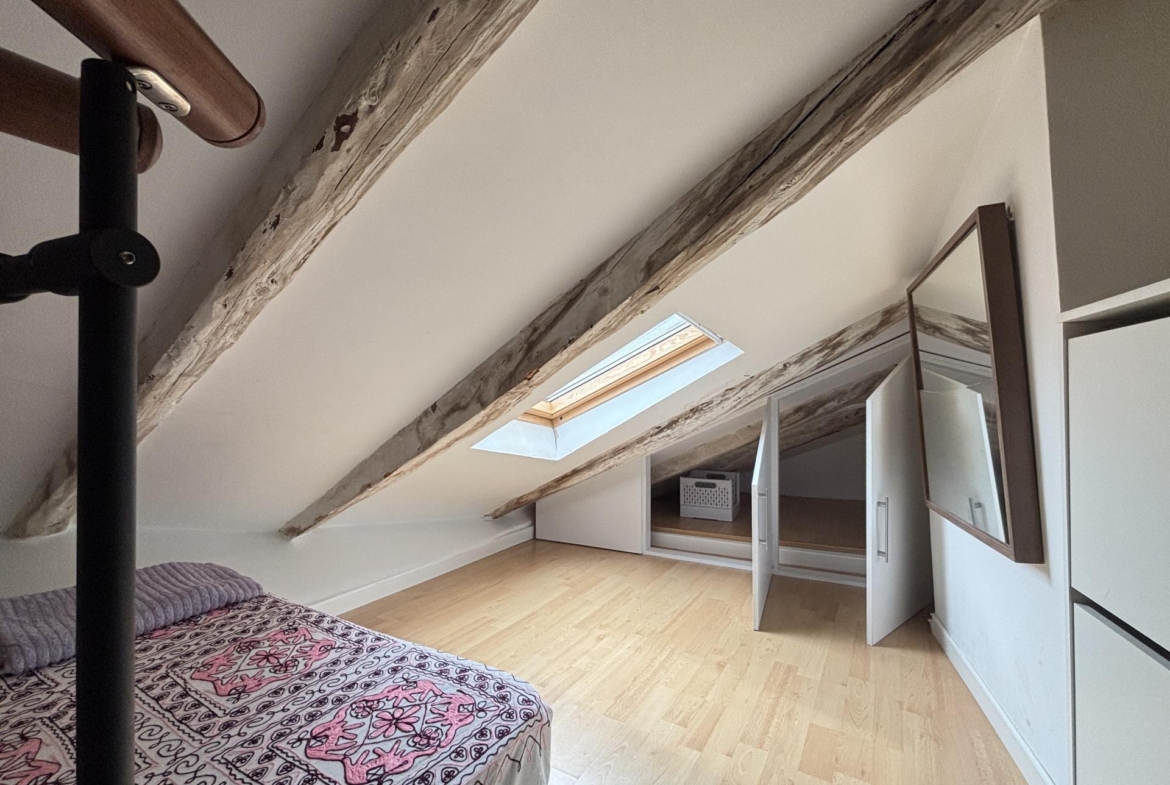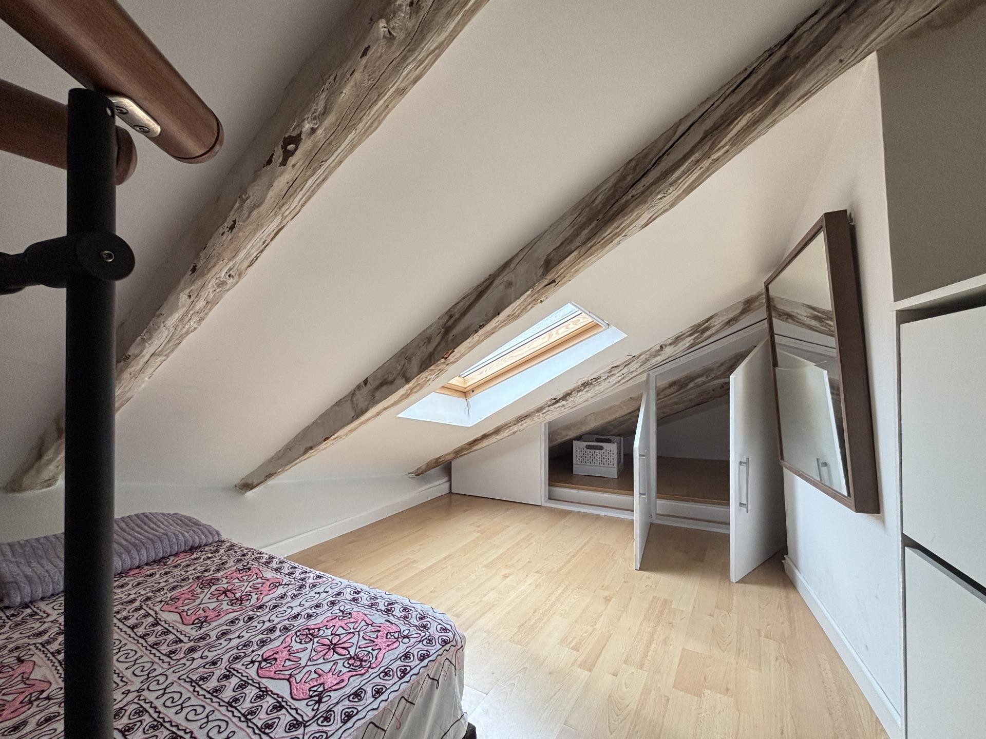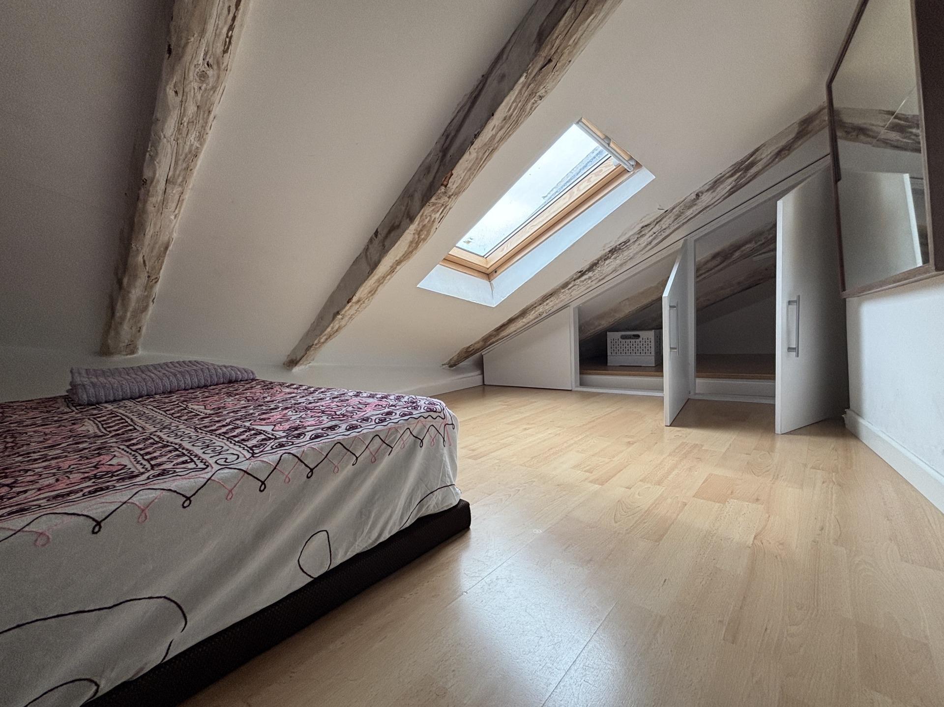 Subiendo por una escalera de caracol, se accede a la zona de descanso abuhardillada, sin mucha altura. Dispone de futón doble y armario empotrado a medida que aprovechan la caída del techo. Una ventana tipo Velux permite dormir viendo el cielo de Madrid y disfrutar de vistas a los icónicos rascacielos de Plaza de España.