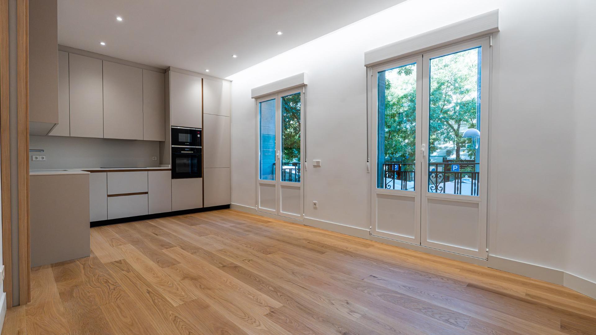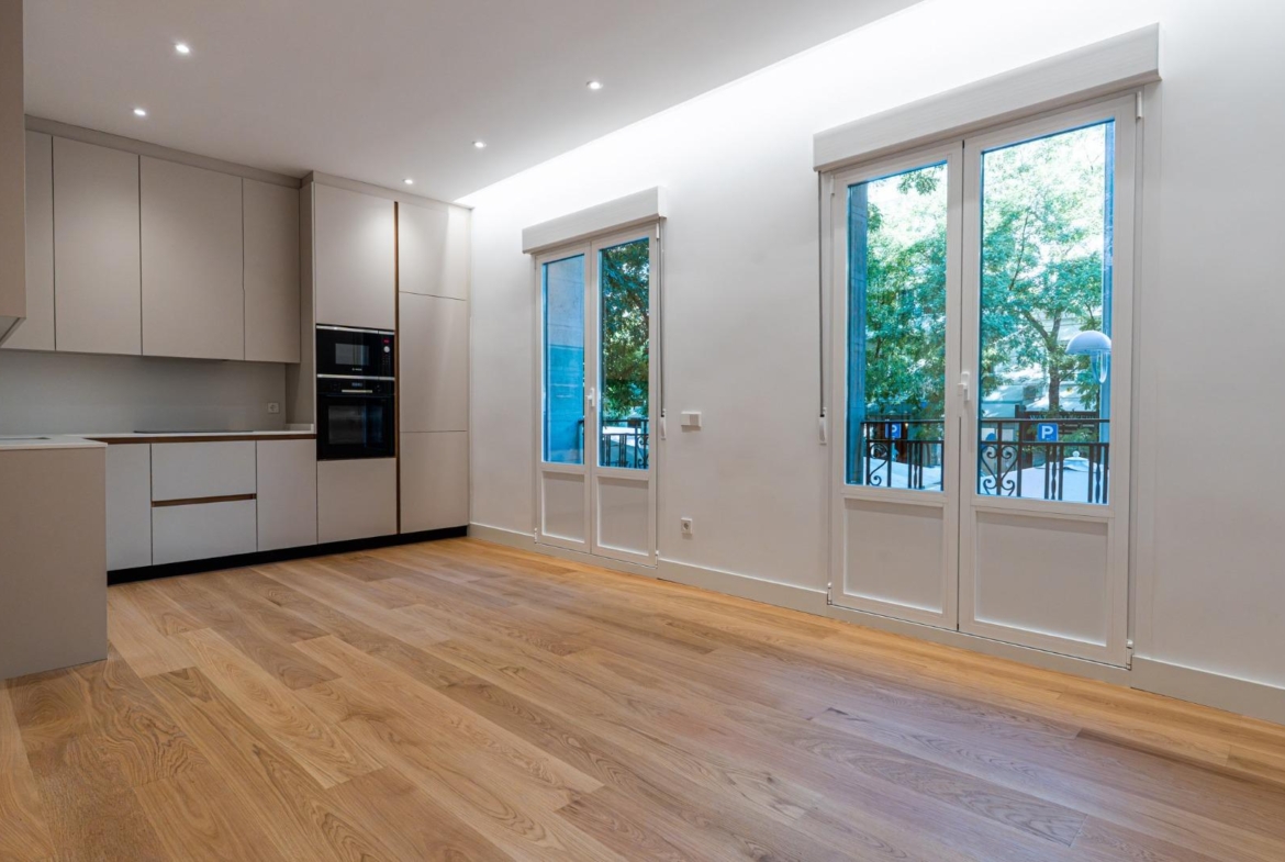 Dispone de una distribución muy funcional. El salón-comedor exterior, cuenta con dos grandes balcones que aportan muchísima luz y ofrecen vistas a la arbolada calle. La cocina, de concepto abierto y diseño minimalista, está totalmente equipada con electrodomésticos de alta gama.
