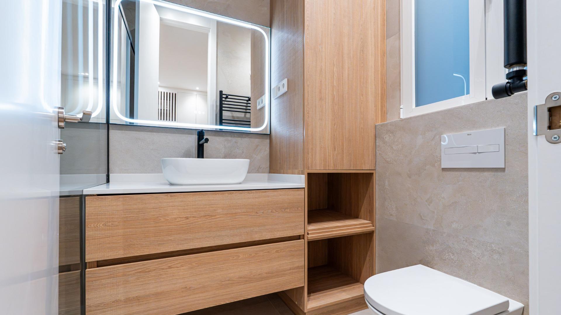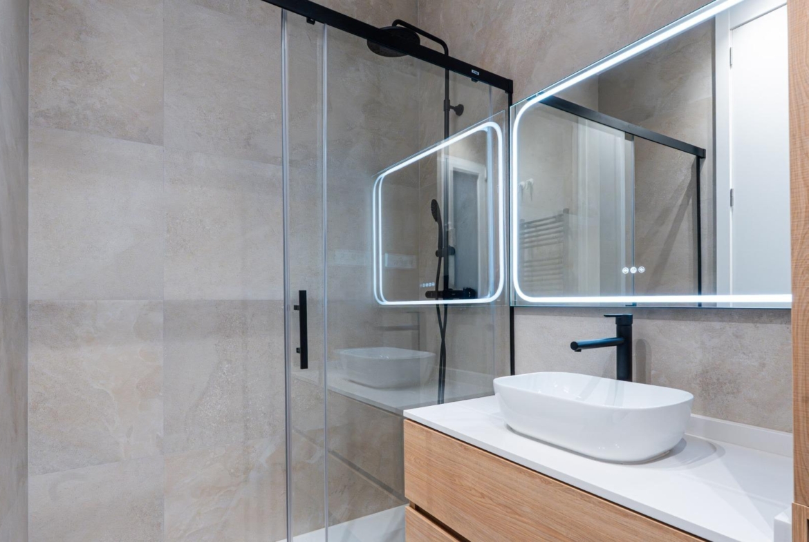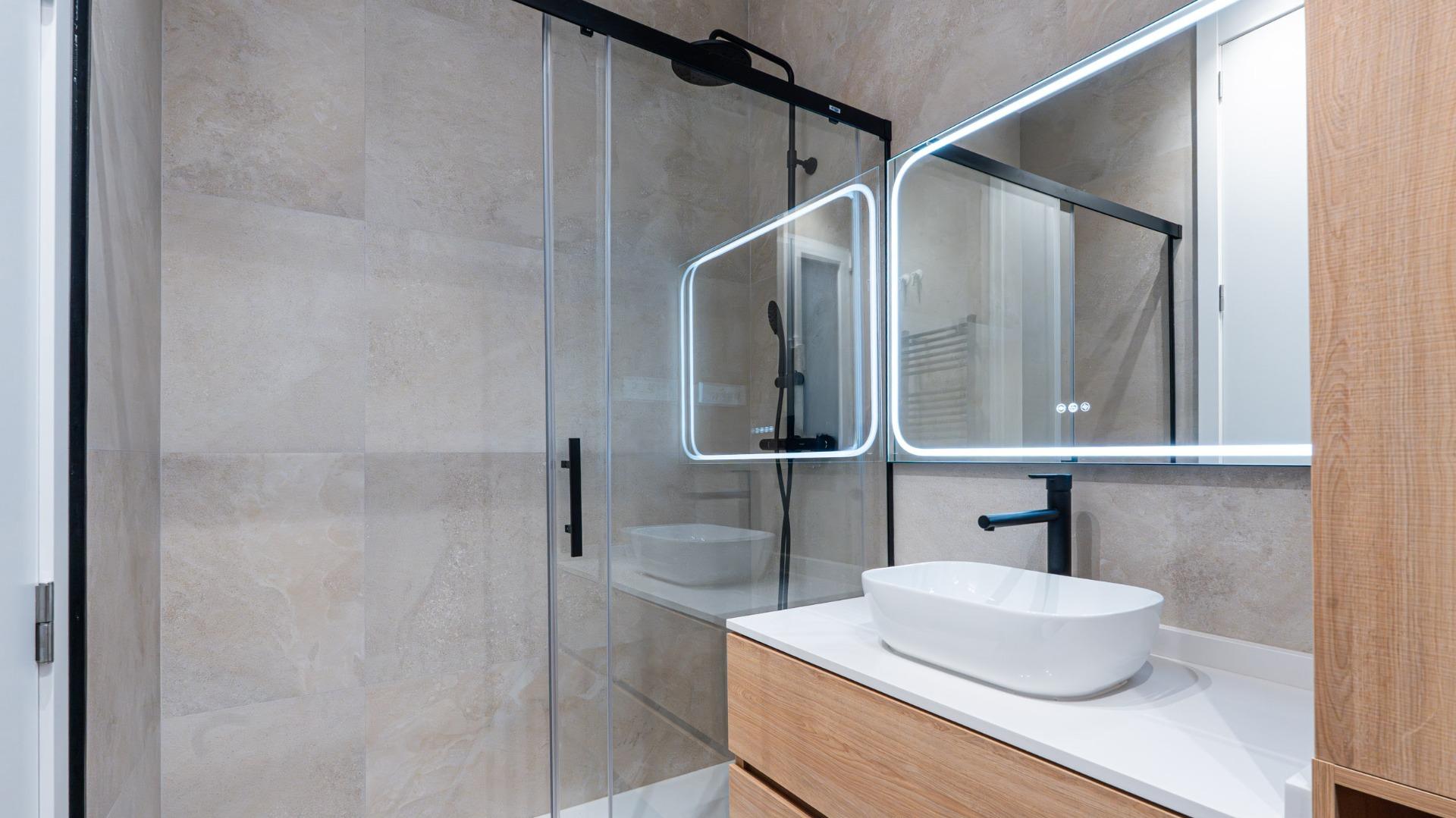 Ambos baños combinan revestimientos porcelánicos en tonos neutros, muebles de madera, grifería negra de diseño, espejos retroiluminados y modernos toalleros calefactores.