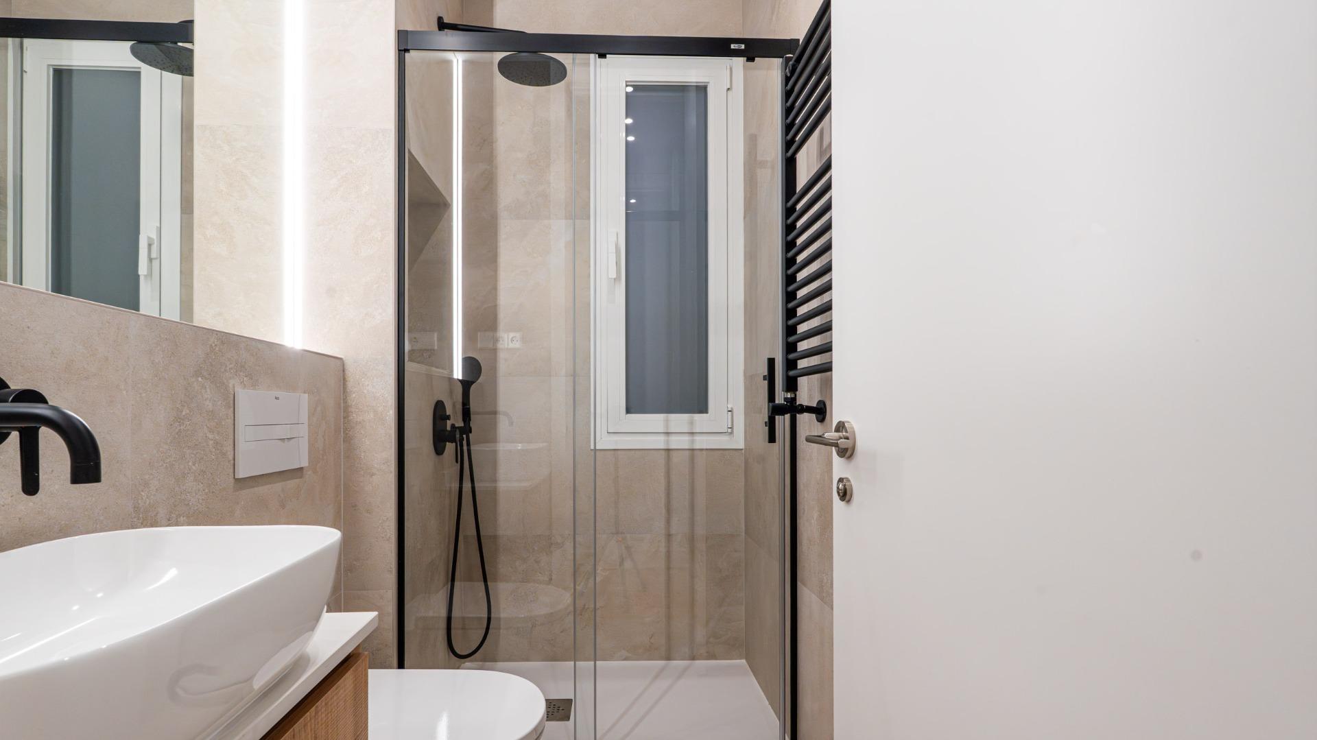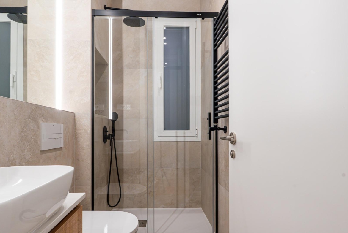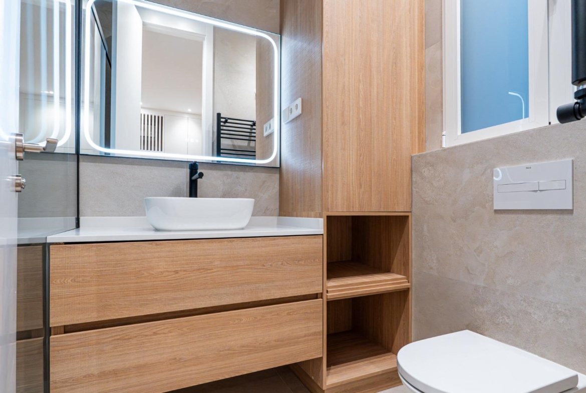 Ambos baños combinan revestimientos porcelánicos en tonos neutros, muebles de madera, grifería negra de diseño, espejos retroiluminados y modernos toalleros calefactores.